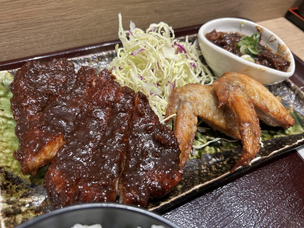 名古屋には「ひつまぶし」「きしめん」「味噌カツ」「あんかけパスタ」「手羽先」「どて煮」「海老フライ」「天むす」など主役を張れるグルメが沢山ありますが、駅ナカにあったお店で味噌カツと手羽先とどて煮の3点が一緒に食べられるスペシャルな定食にしてみました‼︎