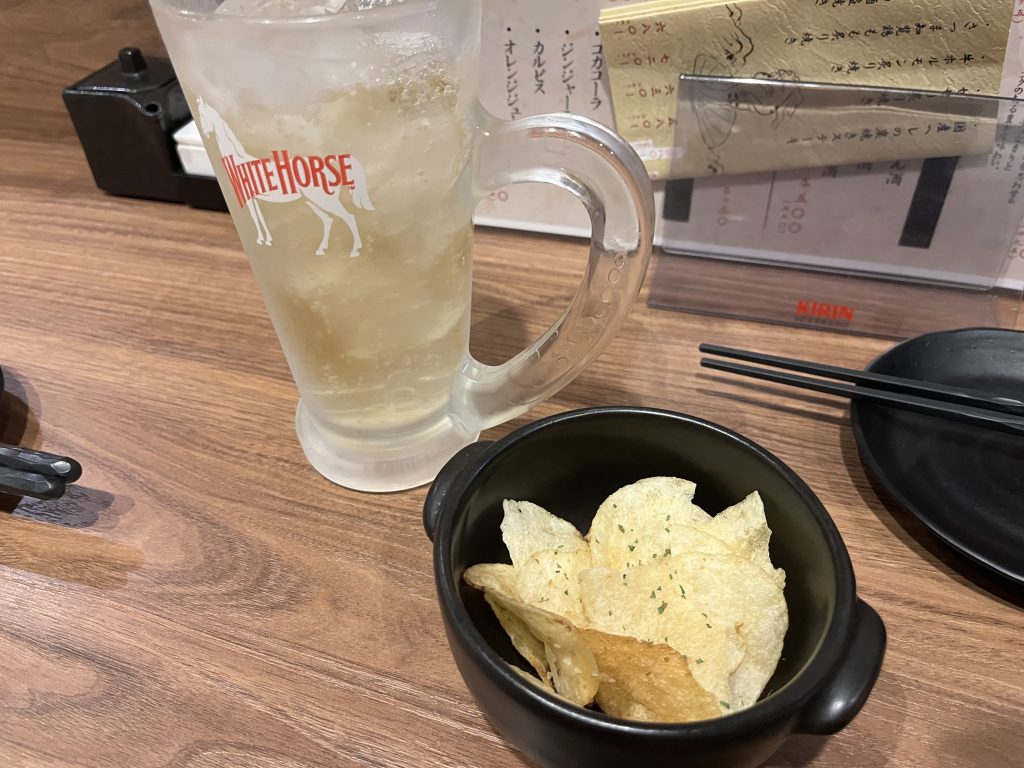 こちらのお店ではお通しのポテトチップを燻製にして出してあります!